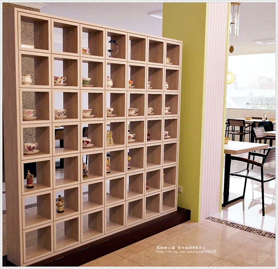 店家巧用設計以一面擺上了店家收藏的杯子的杯子櫃來區劃出動線,