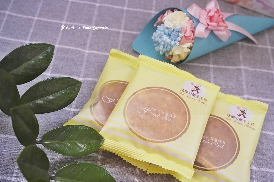 一包包的黃色包裝袋內裝的是蛋奶素的法式焦糖烤片,